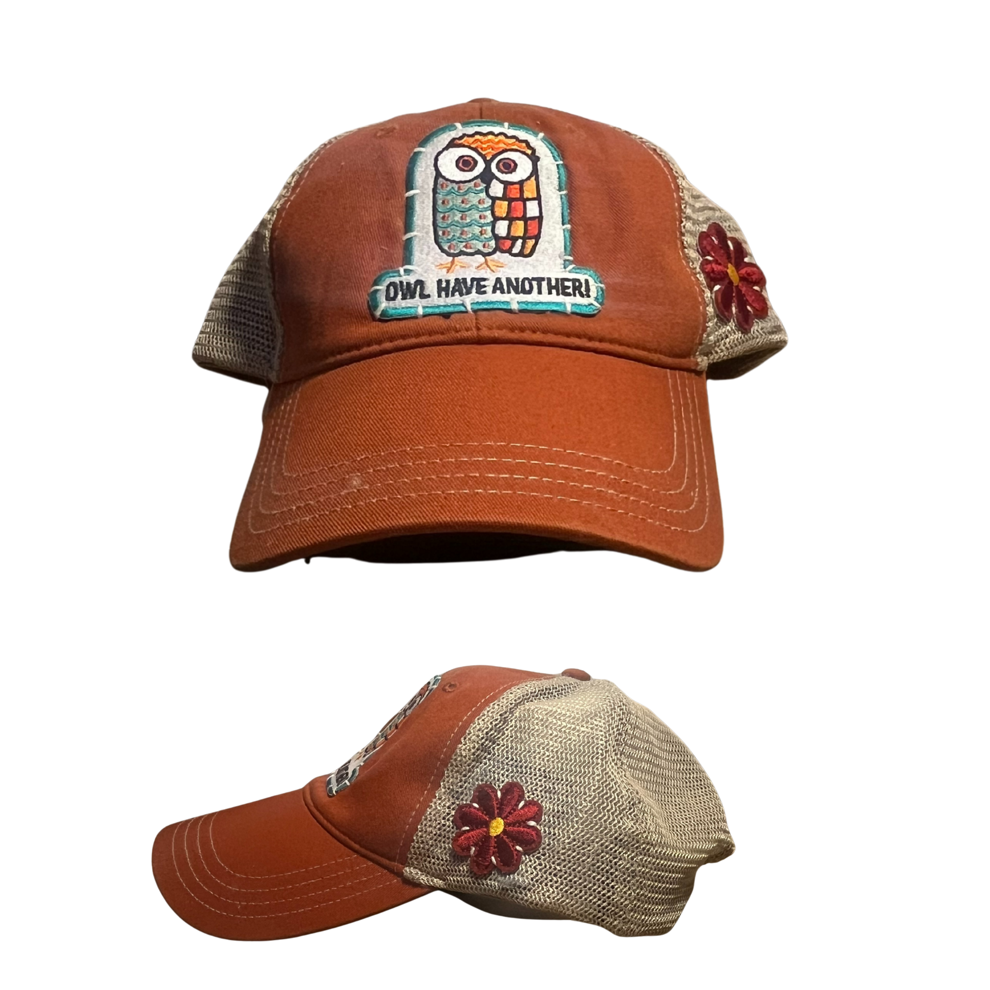 One look and you’ll be hooked! This ultra-comfy, stretch-fit Richardson in cinnamon and off white is pure perfection. Featuring a hand-stitched Maroon Daisy and the iconic "Owl Have Another" patch on the side, it’s quirky, cozy, and completely one of a kind. Adjustable fit for everyone-grab this original before it flies away! 🦉🌼