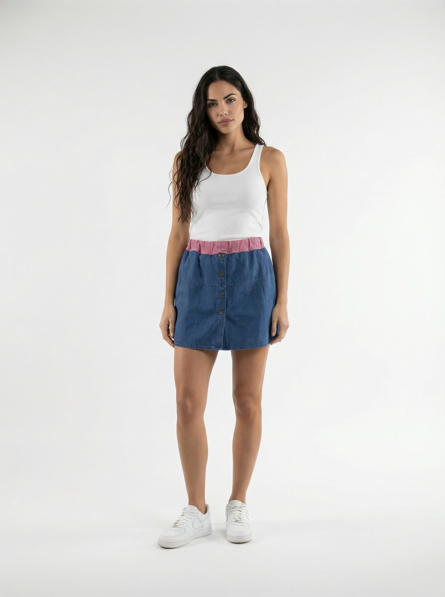Upcycled Navy Blue Cotton Button Up Shirt with a Maroon Sweatshirt Waistband Hand Stitched Around the Top with Elastic. Super Cute and One of a Kind.