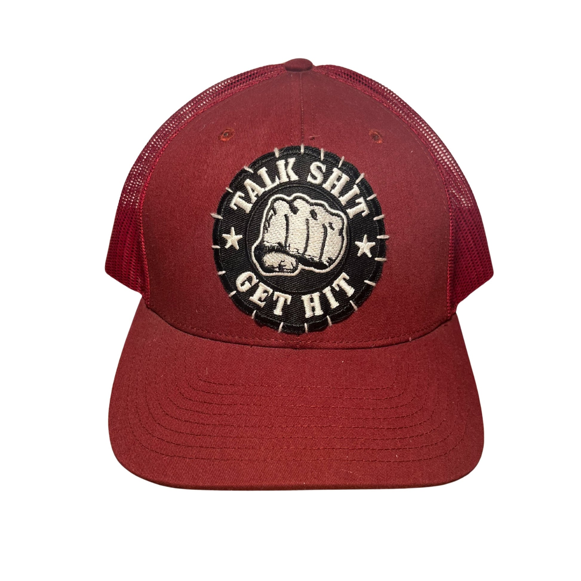 Unisex Richardson Brand 112; Solid Maroon with a Patch Hand Stitched on to the Trucker Hat; Adjustable; Original; Cotton, Polyester, Mesh